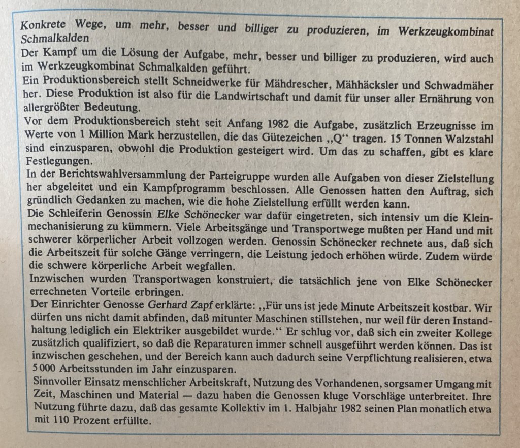 Sinnvoller Einsatz menschlicher Arbeitskraft, Nutzung des Vorhandenen, sorgsamer Umgang mit Zeit, Maschinen und Material- dazu hatten die Genossinnen und Genossen kluge Vorschläge unterbreitet. Ihre Nutzung führte dazu, dass das gesamte Kollektiv im 1. Halbjahr 1982 seinen Plan monatlich etwa mit 110 Prozent erfüllte.