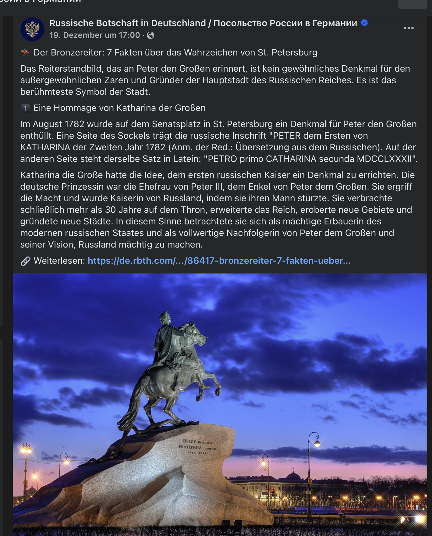 Die heutige Russische Botschaft stellt es in ihrem Facebook-Eintrag zum Denkmal für Peter den Großen, wieder anders dar.