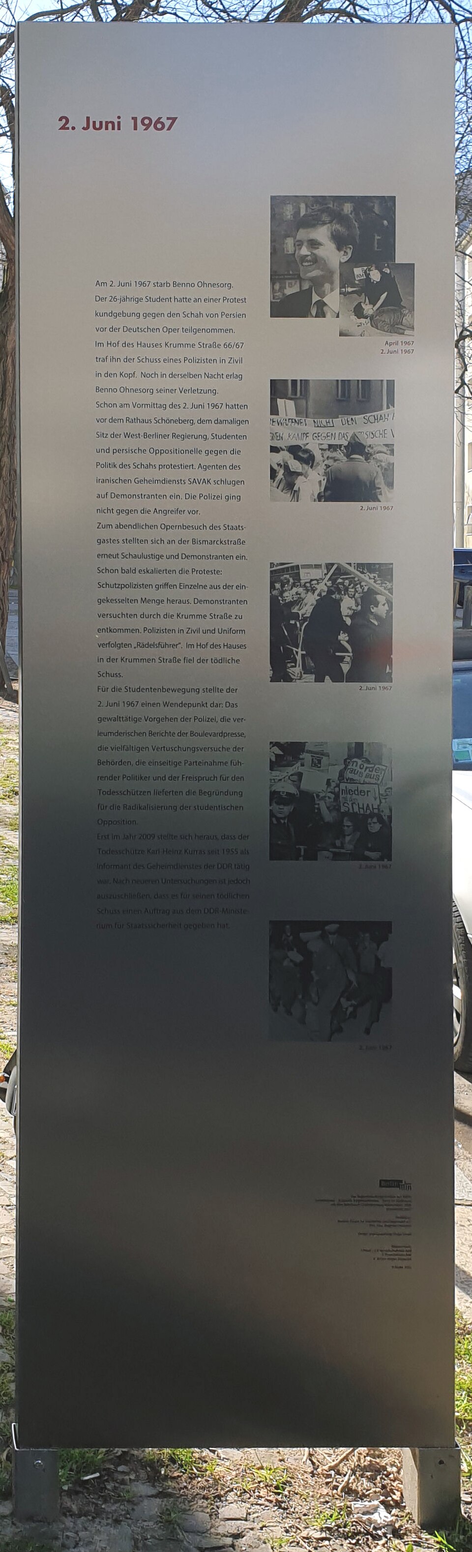 Benno Ohnesorg, geboren am 15. Oktober 1940 in Hannover, gestorben am 02. Juni in Westberlin war ein deutscher Student, der bei der Demonstration 02. Juni 1967 in Westberlin gegen den Staatsbesuch des Schahs von Persien, Mohammed Reza Pahlavi von Karl-Heinz Kurras erschossen wurde. Das machte ihn bekannt und trug wesentlich dazu bei, dass sich die westdeutsche Studentenbewegung der 1960er Jahre bundesweit ausbreitete und radikalisierte. Sein Todestag gilt als Einschnitt der westdeutschen Nachkriegsgeschichte mit weitreichenden gesellschaftspolitischen Folgen.