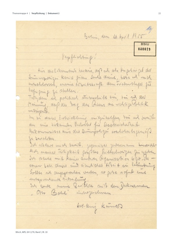 Um bei dieser Entwicklung mitzuhelfen, bin ich bereit, dem mir bekannten Vertreter der Staatssicherheit Vorkommnisse aus der Stummpolizei wahrheitsgemäß zu berichten.