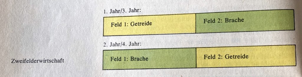 In einem Jahre wurde nur die eine Hälfte der Felder bewirtschaftet, während die andere Hälfte brach liegen blieb. Damit erreichten die Bauern im nächsten Jahr wieder eine gute Ernte. Dich Brachfelder wurden auch als Weide für das Vieh genutzt.