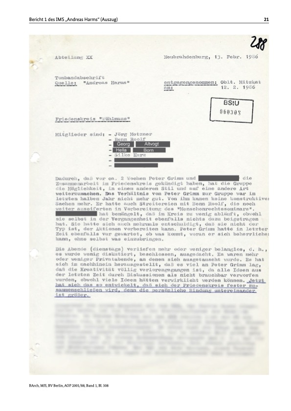 Am 19.06.1986 erfolgte die Absprache zwischen dem Genossen Mitzkat der Abteilung xx der Bezirksverwaltung Neubrandenburg und dem Unterzeichner. Genosse Mitzkat brachte zum Ausdruck, dass es derzeitig unmöglich ist, den IMS „Andreas Harms“ aus der Laienspielgruppe „Die Wühlmaus“ herauszulösen.