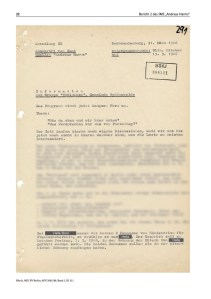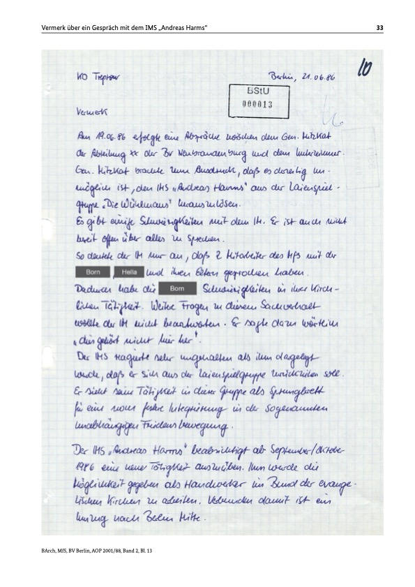 So deutete der IM nur an, dass 2 Mitarbeiter des MfS mit der Born, Hella und ihren Eltern gesprochen haben. Dadurch habe die Born Schwierigkeiten in der kirchlichen Tätigkeit. Weitere Fragen zu diesem Sachverhalt wollte der IM nicht beantworten. Er sagte dazu wörtlich „die gehört nicht hierher!“
