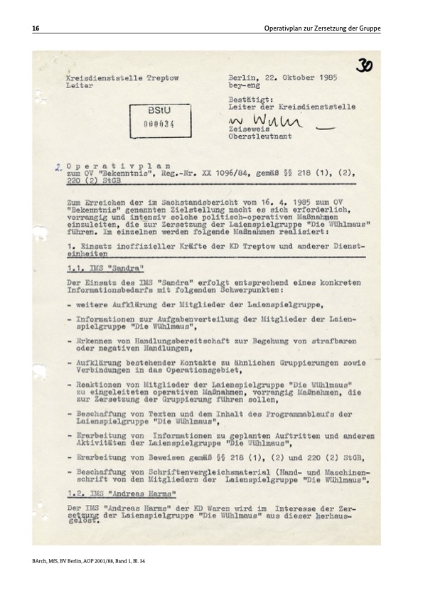 Mit der Übersiedlung des Herrn Buchheim soll der Zersetzungsprozess der im Operationsvorgang „Bekenntnis“ der Kreisdienststelle Treptow bearbeiteten Laienspielgruppe „Die Wühlmaus“ eingeleitet werden.