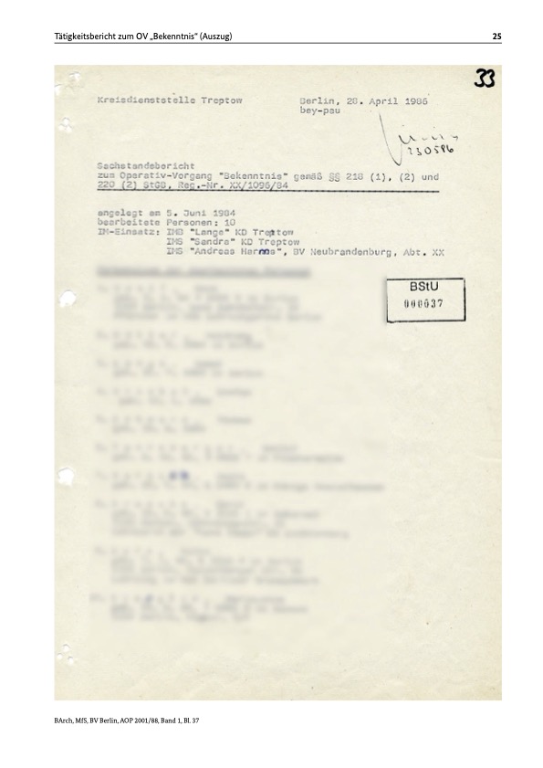 Die weiteren konkreten Maßnahmen zur Bearbeitung des OV „Bekenntnis“ werden in einem gesonderten Operativplan festgelegt. Der Operativplan wird bis zum 5. Mai 1986 erarbeitet.