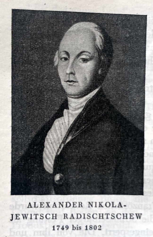 Noch mehr erschreckt wurde die Zarin Jekaterina II. (Katharina die Große) von einem Werk, das im Jahre 1770 ohne Verfasserangabe unter dem Titel „Eine Reise von Petersburg nach Moskau“ erschien. Dieses Werk entlarvte mit Kühnheit und Offenheit die auf der Leibeigenschaft beruhende Ordnung und malte die Gräuel der Leibeigenschaft aus. Als dieses Buch Jekaterina II. (Katharina die Große) in die Hände geriet, hielt sie den Verfasser für einen „schlimmeren Verbrecher als Pugatschow“. Als Verfasser entpuppte sich Alexander Nikolajewitsch Radischtschew, einer der gebildetsten Leute des 18. Jahrhunderts. Mit außergewöhnlicher Leidenschaft und Kraft entlarvte er die Verhöhnung der Bauern durch die Gutsbesitzer: „Ich schaute um mich, und meine Seele wurde durch die menschlichen Leiden verwundet. Ich wandte meine Blicke in mein Inneres und wurde gewahr, dass die Leiden der Menschen vom Menschen selbst ausgehen.“ An die Gutsbesitzer sich wendend, die sich gegenüber den Bauern unmenschlich verhielten, rief Radischtschew zornig aus: „Gierige Tiere, unersättliche Blutegel, was lassen wir den Bauern? Das, was wir nicht wegnehmen können: die Luft! Ja, nur die Luft!“