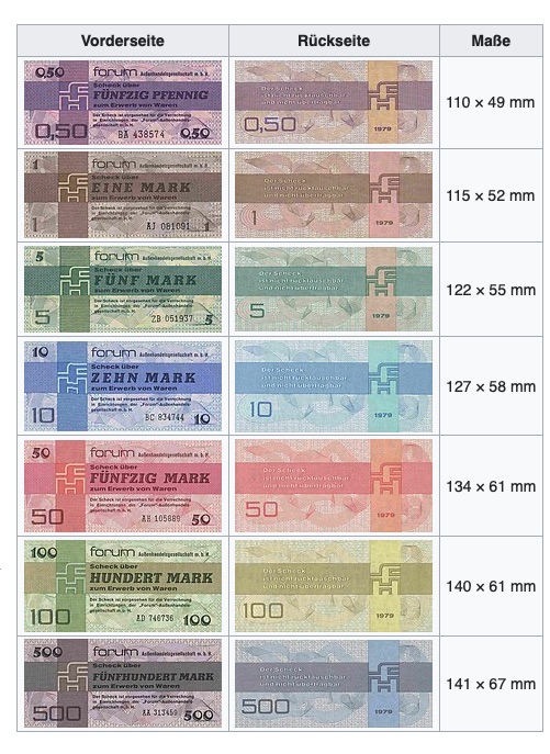 Die Forumschecks galten in den Einrichtungen des DDR Außenhandels wie beispielsweise Intershop, Intertank oder Genex.[4]Dort wurden sie wie Geld behandelt, das heißt bei Zahlung mit Forumschecks wurde das „Wechselgeld“ auch in Forumschecks zurückgegeben (kleinere Beträge als 50 Forumscheck-Pfennig wurden meist in Form von Schokoladentäfelchen oder Lutschern à 10 Pfennig erstattet).