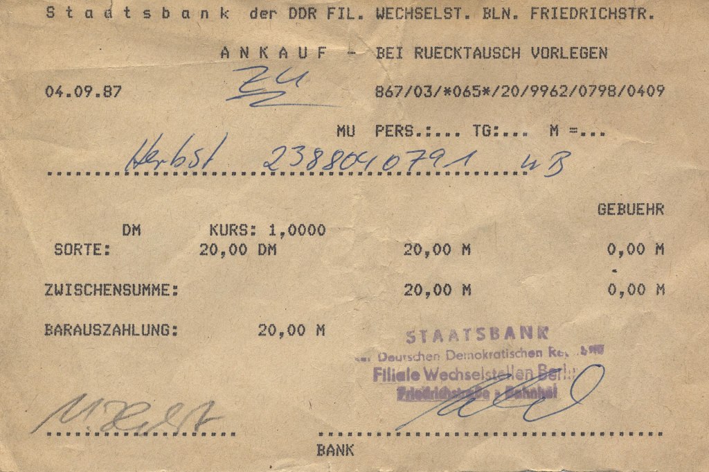 Umtauschbescheinigung der Staatsbank der DDR, Bhf Berlin Friedrichstraße, 20 DM in 20 M der DDR – 1987