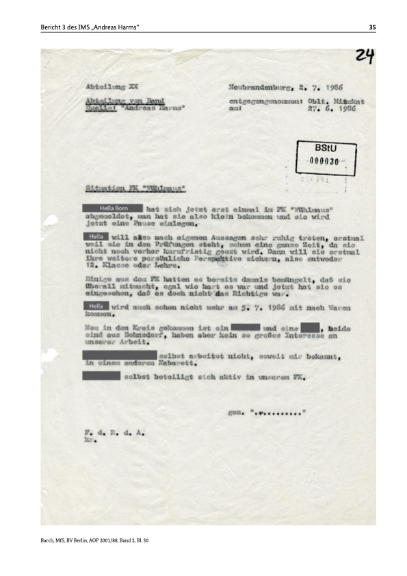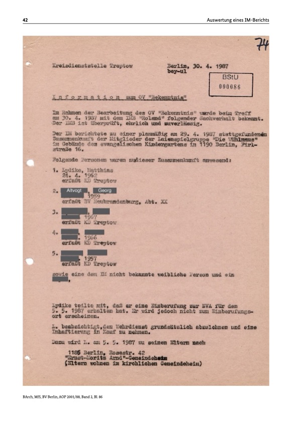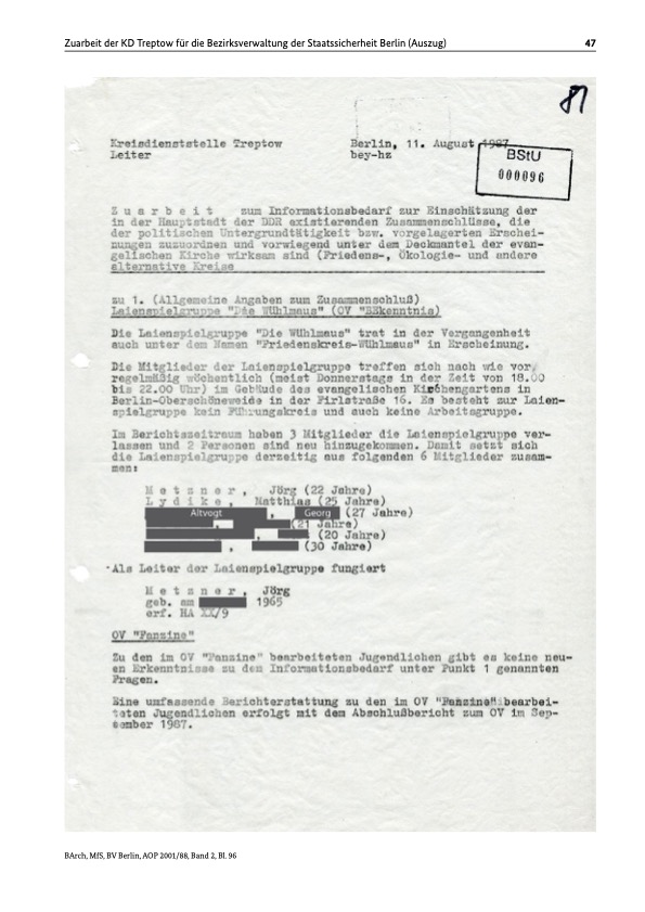 Die von Ihnen aufgeführten Mitglieder bzw. ehemaligen Mitglieder der Laienspielgruppe „Die Wühlmaus“ werden bzw. wurden im OV (Operationsvorgang) „Bekenntnis“ der KD (Kreisdienststelle) Treptow erfasst.
