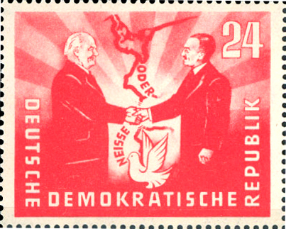 Görlitzer Abkommen: Wilhelm Pieck und Boleslaw Bierut reichen sich über die Oder-Neiße-Grenze die Hände, Briefmarke der DDR von 1951