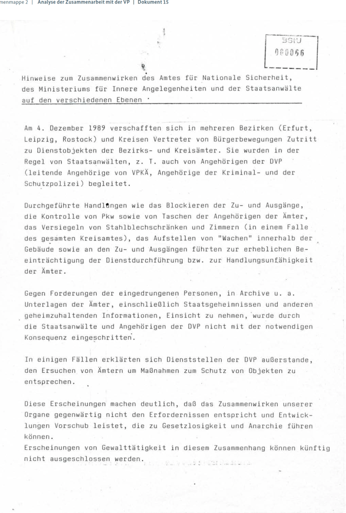 Gegen Forderungen der eingedrungenen Personen, in Archive u.a. Unterlagen der Ämter, einschließlich Staatsgeheimnissen und anderen geheimzuhaltenden Informationen, Einsicht zu nehmen, wurde durch die Staatsanwälte und die Angehörigen der Deutschen Volkspolizei nicht mit der notwendigen Konsequenz eingeschritten.