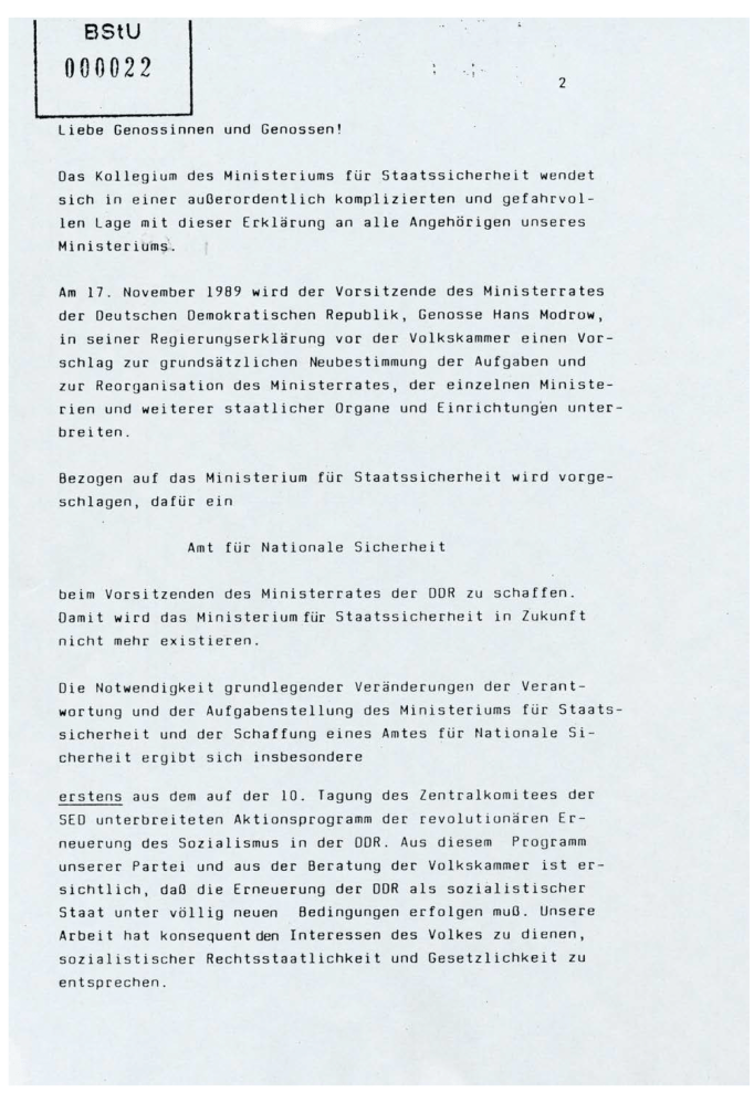 Erklärung des Kollegiums des MfS zum Thema Umstellung des MfS zum AfNS(Vom Ministerium für Staatssicherheit zum Amt für Nationale Sicherheit)