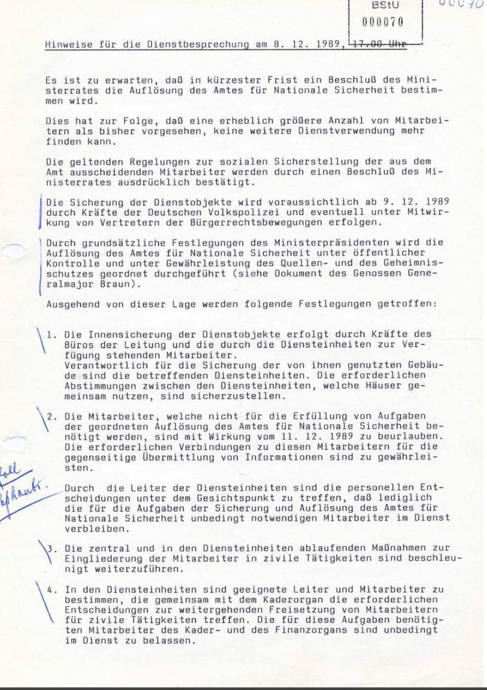 • Durch die Leiter der Diensteinheiten sind die personellen Entscheidungen unter dem Gesichtspunkt zu treffen, dass lediglich die für die Aufgaben der Sicherung und Auflösung des Amtes für Nationale Sicherheit unbedingt notwendigen Mitarbeiter im Dienst verbleiben.