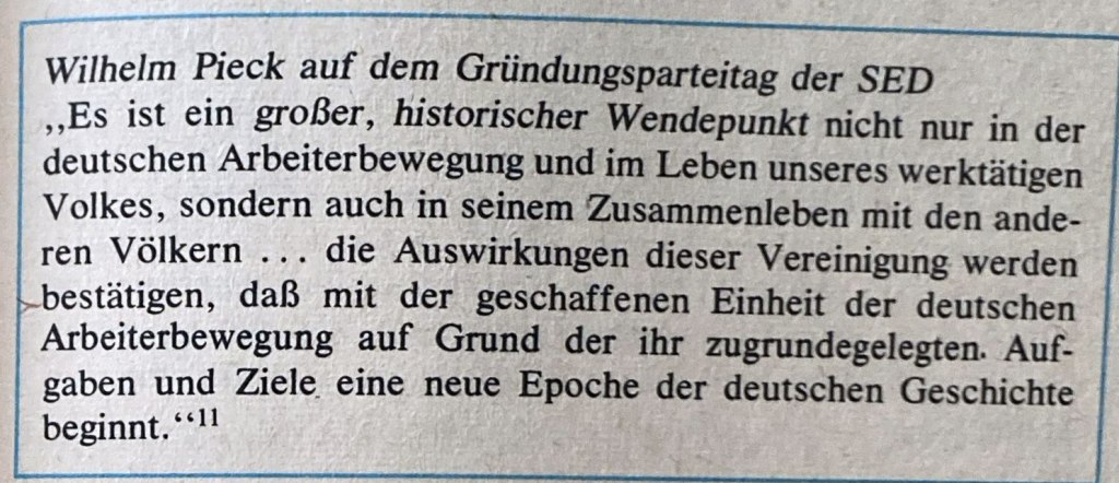 Den imperialistischen Gegnern missfiel auch, dass die SED überall dort organisiert war, wo die Menschen arbeiteten und lebten. Deshalb haben sie stets beklagt, dass die SED „allmächtig und „überall gegenwärtig“; nirgends konnte man ohne die SED sein usw. Aber es war gerade der Vorzug der SED: Weil sie zunächst überall eng mit dem Leben und der Arbeit der Massen verbunden war, deshalb vermochte sie, die Interessen der Massen zu kennen und die Massen zu gewinnen. (Das änderte sich aber mit der Zeit. P.R.)