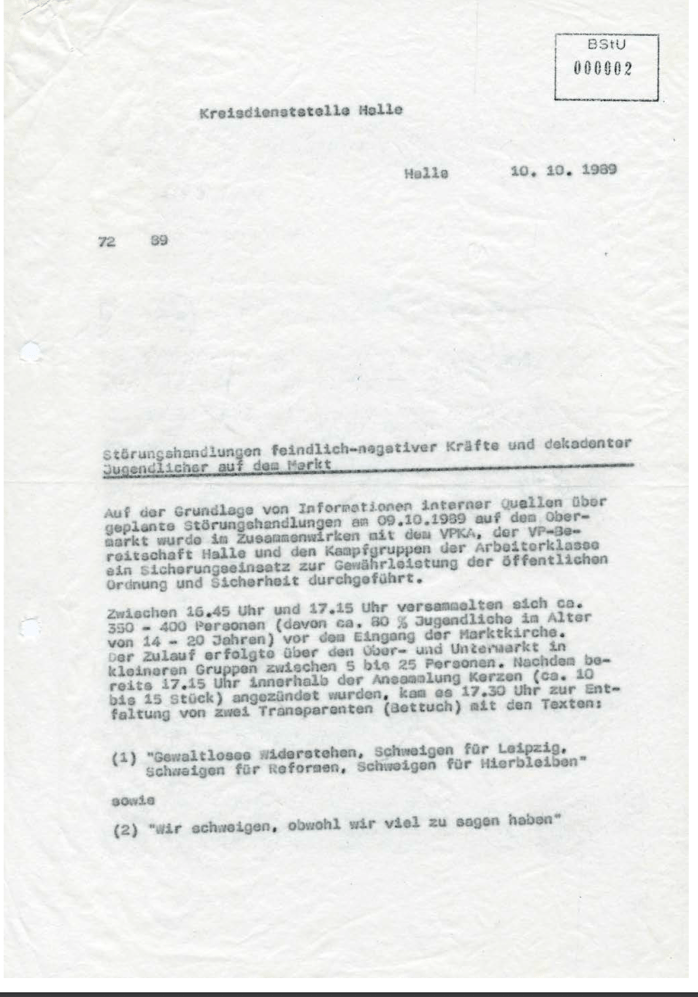 Auf der Grundlage von Informationen interner Quellen über geplante Störungshandlungen am 09.10.1989 auf dem Obermarkt wurde im Zusammenwirken mit dem Volkspolizei-Kreisamt, Der Volkspolizei-Bereitschaft Halle und in den Kampfgruppen der Arbeiterklasse ein Sicherungseinsatz zur Gewährleistung der öffentlichen Ordnung und Sicherheit durchgeführt.