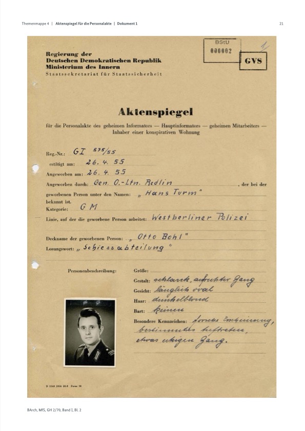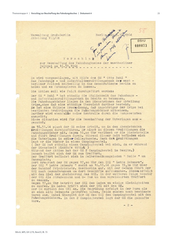Es wird vorgeschlagen, mit Hilfe des GM (GM ist das, was später IM waren. P.R.)„Otto Bohl“ das Fahndungs- und Aufenthaltsermittlungsbuch der Westberliner Polizei zeitweilig in das demokratische Berlin zu holen und es fotokopieren zu lassen.