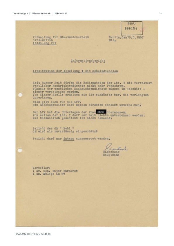 Zur Zeit werden alte Akten überarbeitet, mit dem Ziel, neue Hinweise über Agenten, die in Westberlin tätig sind oder gewesen sind, zu erhalten. Gleichzeitig werden mit Hinweise erarbeitet, um Verbindungen in der DDR zu schaffen. Diese Hinweise sind an den amerikanischen Sicherheitsoffizier abzugeben. In diesem Zusammenhang hat „Bohl“ eine Akte bearbeitet, über einer ehemaligen Westberliner Kripo namens P. Dieser P. hat für das MfS gearbeitet und wurde in Westberlin verurteilt. Nach seiner Haft ist P. ins demokratische Berlin gegangen. Der P. wurde festgenommen durch einen Spitzel der in Weissensee wohnhaft ist. Dieser Spitzel hat mit dem MfS zusammengearbeitet und gleichzeitig für den Verfassungsschutz. Dieser Spitzel ist „Bohl“ bekannt und er wird die Personalien im nächsten Brief mitteilen. „Bohl“ konnte mir den Namen nicht nennen, da er die Personalien nicht auswendig kannte.