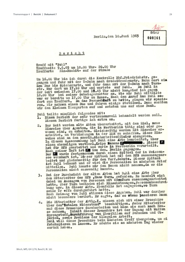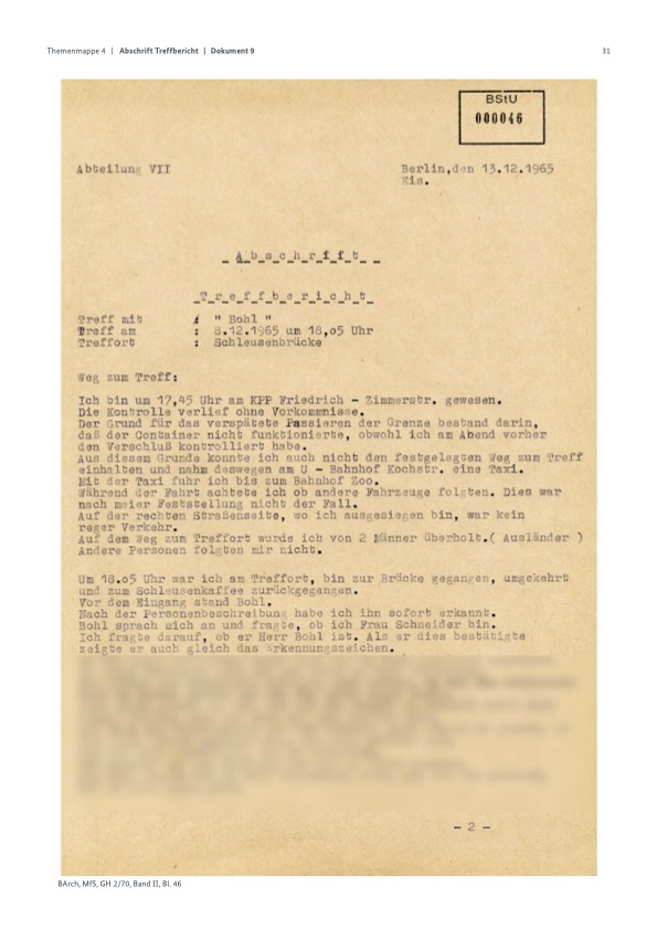 Für die Rückfahrt benutzte ich die U-Bahn vom Ernst Reuter-Platz bis Hallisches Tor. Bin dort umgestiegen und fuhr bis Kochstr. Die Kontrolle an der Grenze verlief ohne Vorkommnisse. Während des Zusammenseins mit Bohl und auf dem Wege zurück konnte ich nichts Außergewöhnliches und Verdächtiges feststellen.