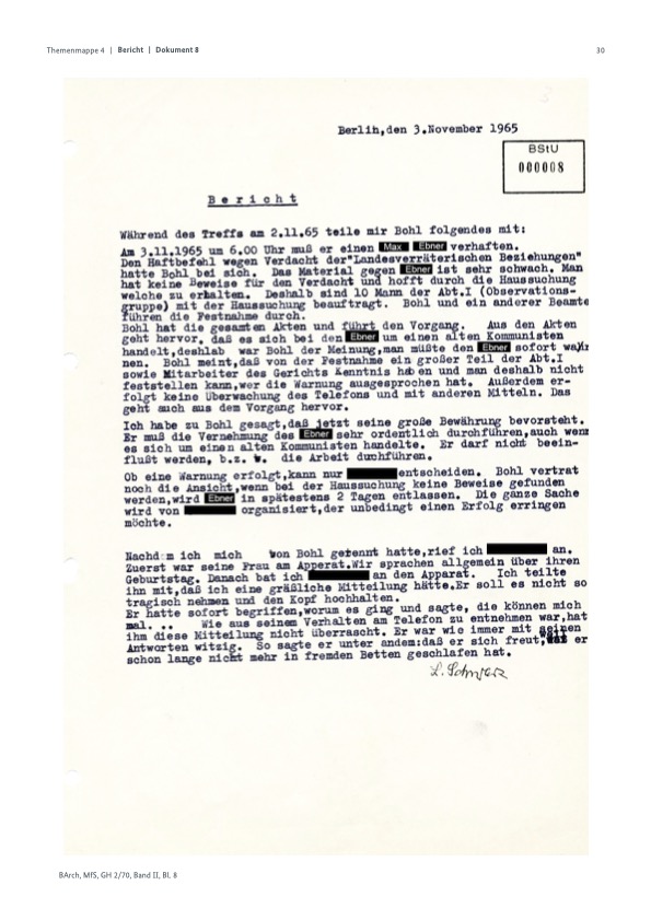 „Bohl“ hat die gesamten Akten und führt den Vorgang. Aus den Akten geht hervor, dass es sich bei Ebner um einen alten Kommunisten handelt, deshalb war Bohl der Meinung, man müsste Ebner sofort warnen. „Bohl“ meint, dass von der Festnahme ein großer Teil der Abteilung I sowie Mitarbeiter des Gerichts Kenntnis haben und man deshalb nicht feststellen kann, wer die Warnung ausgesprochen hat. Außerdem erfolgt keine Überwachung des Telefons und mit anderen Mitteln. Das geht auch aus dem Vorgang hervor.