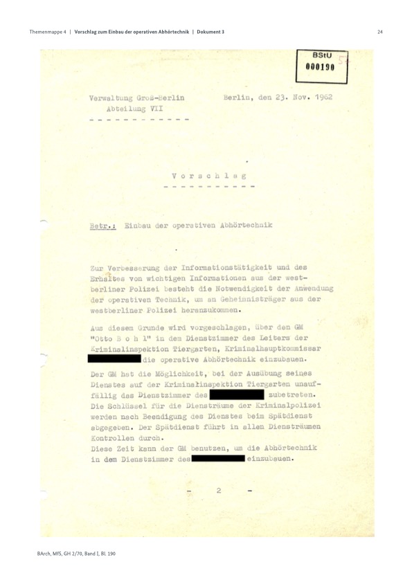 „Otto Bohl“ in dem Dienstzimmer des Leiters der Kriminalinspektion Tiergarten, Kriminalhauptkommissar (Name geschwärzt) die operative Abhörtechnik einzubauen.